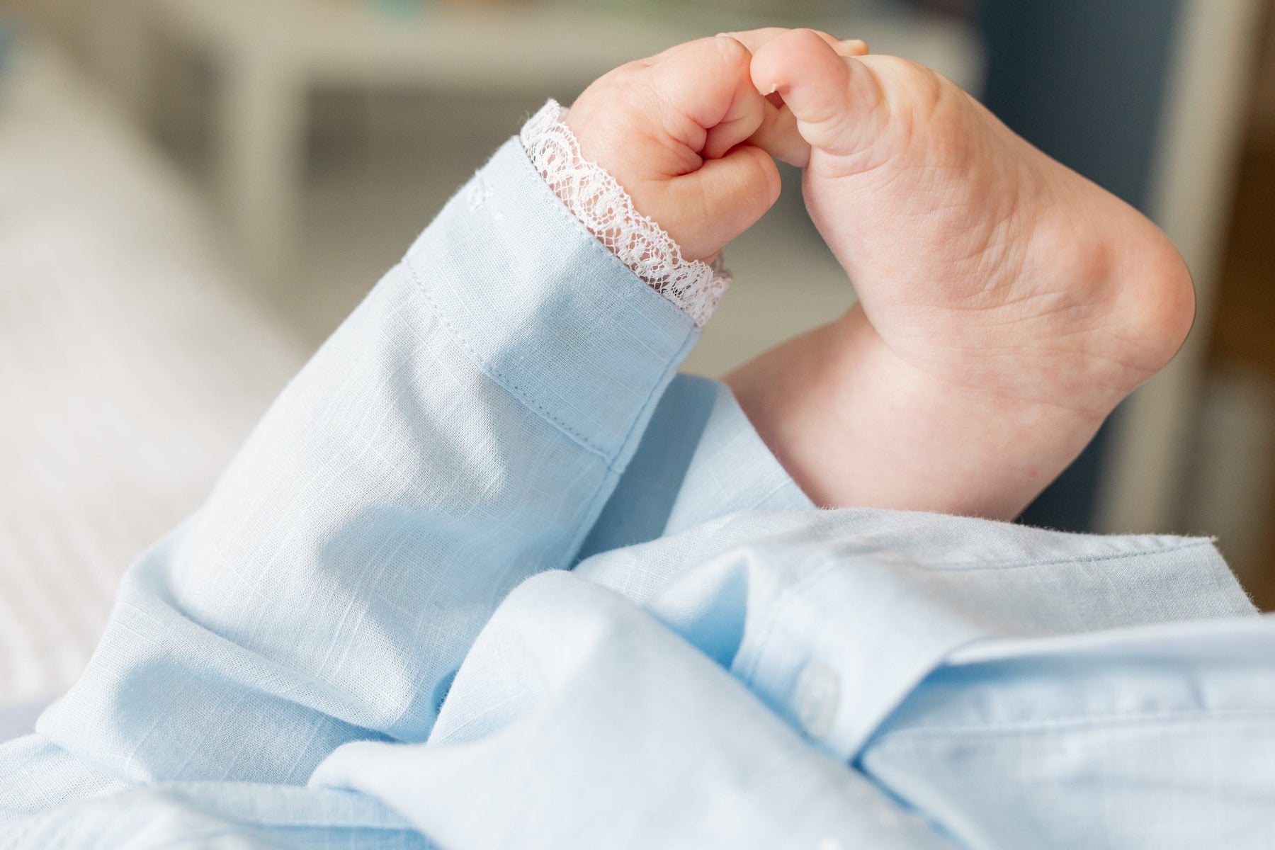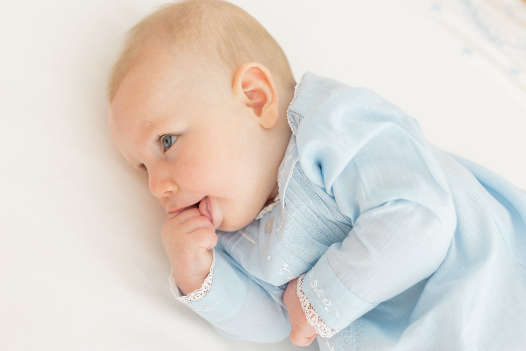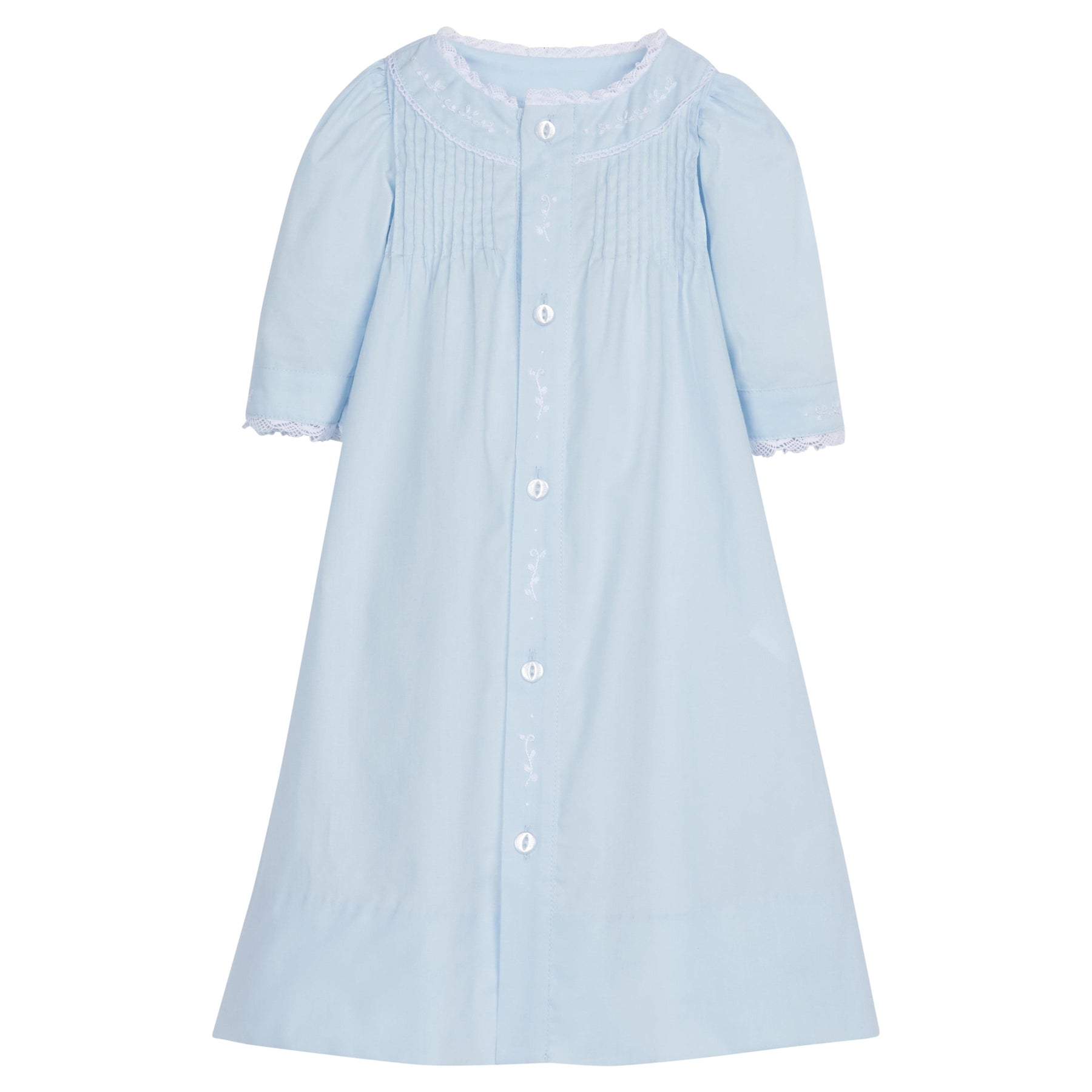 Our Ryeland Day Gowns are so sweet for baby. This soft, light blue gown features pintucks at the chest, delicate lace at the collar and cuffs, and finely embroidered floral vine detailing at the collar, cuffs, and down the placket. This newborn gown is a gift both mom and baby will love! Lightweight and elegant, our Ryeland Day Gown is a picture-perfect addition to your little one's closet.