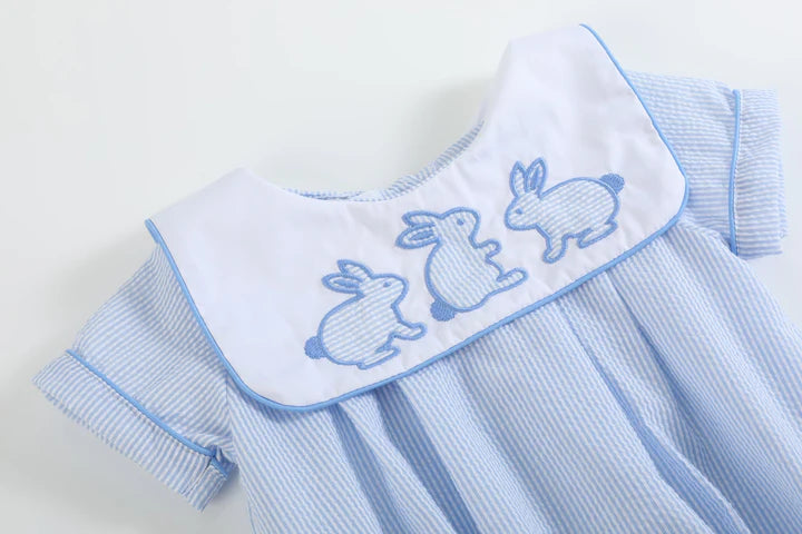 Get your little man hoppin' around in this adorable Blue Stripe Bunny Romper! With a playful bunny applique, this romper is perfect for springtime adventures. Comfortable and cute, your little one will love wearing this all day long.