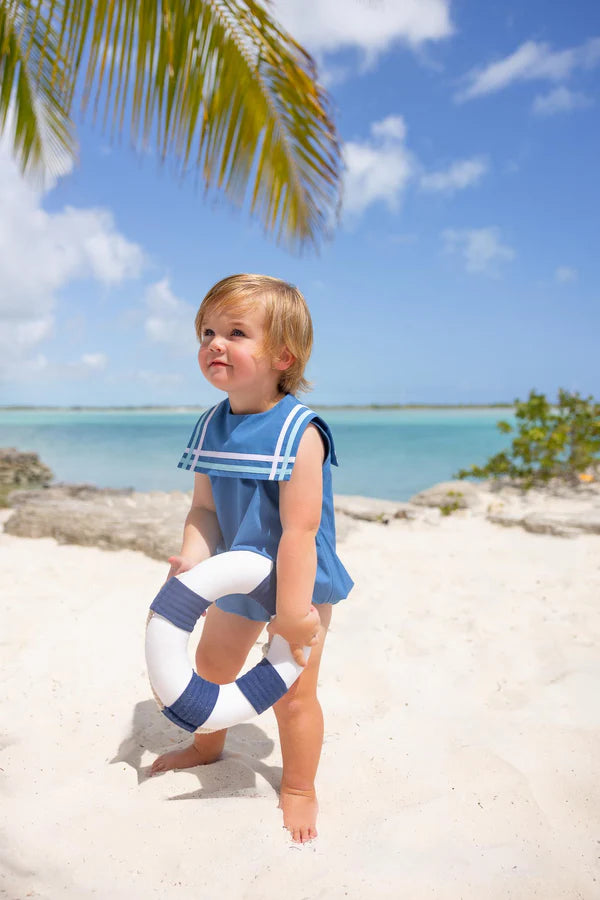 Nautical and nice, the Sleeveless Townes Top Sail Bubble in Wood Boat Blue with Belhaven Blue & Worth Avenue White is a coastal classic for the little sailor. This boys' bubble romper is a comfortable sleeveless style that's perfect for warm days, beach trips, and summer celebrations. Lightweight, easy to wear, and effortlessly handsome, it's the breezy one-piece that keeps him cool and looking sharp all season long.
