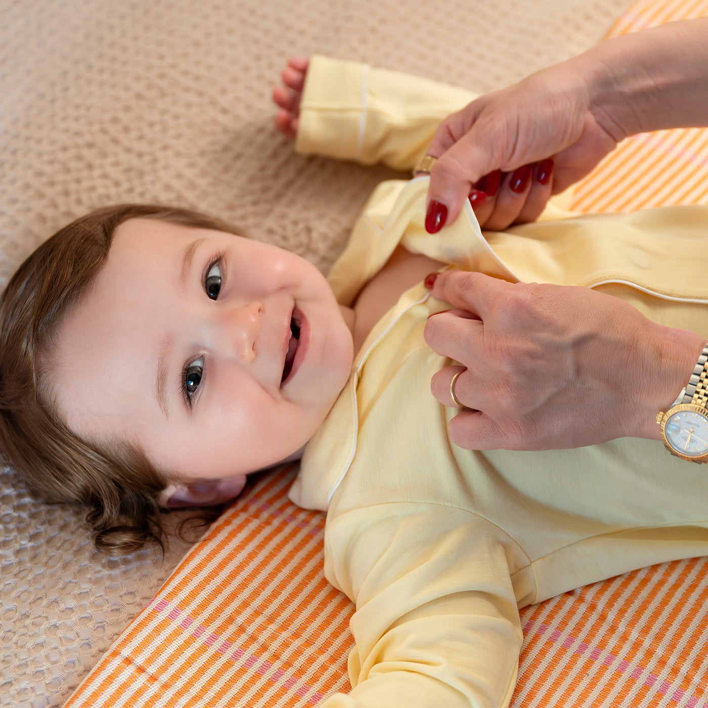 Our RightFit™ Magnetic Classic With A Twist PJ Set is designed with magnets that make do-it-myself dressing easy. Even more to love: our revolutionary RightFit™ fabric, a classic piping design, and silhouette to match mom and dad. With a super soft modal blend and relaxed fit, it also offers natural, non-toxic flame resistance.