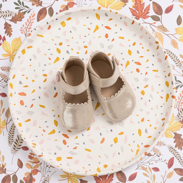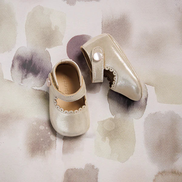 These adorable Mary Jane shoes combine style and comfort for your little one. Featuring soft construction with scalloped edges, extra cushioning in the leather insole, and a breathable lining to keep feet cozy. The supple, natural sheepskin lining adds a luxurious touch. The hook-and-loop strap with a decorative pearled button ensures easy wear. Flexible soles offer support and grip, with a classic Elephantito paw design on the rubber soles.