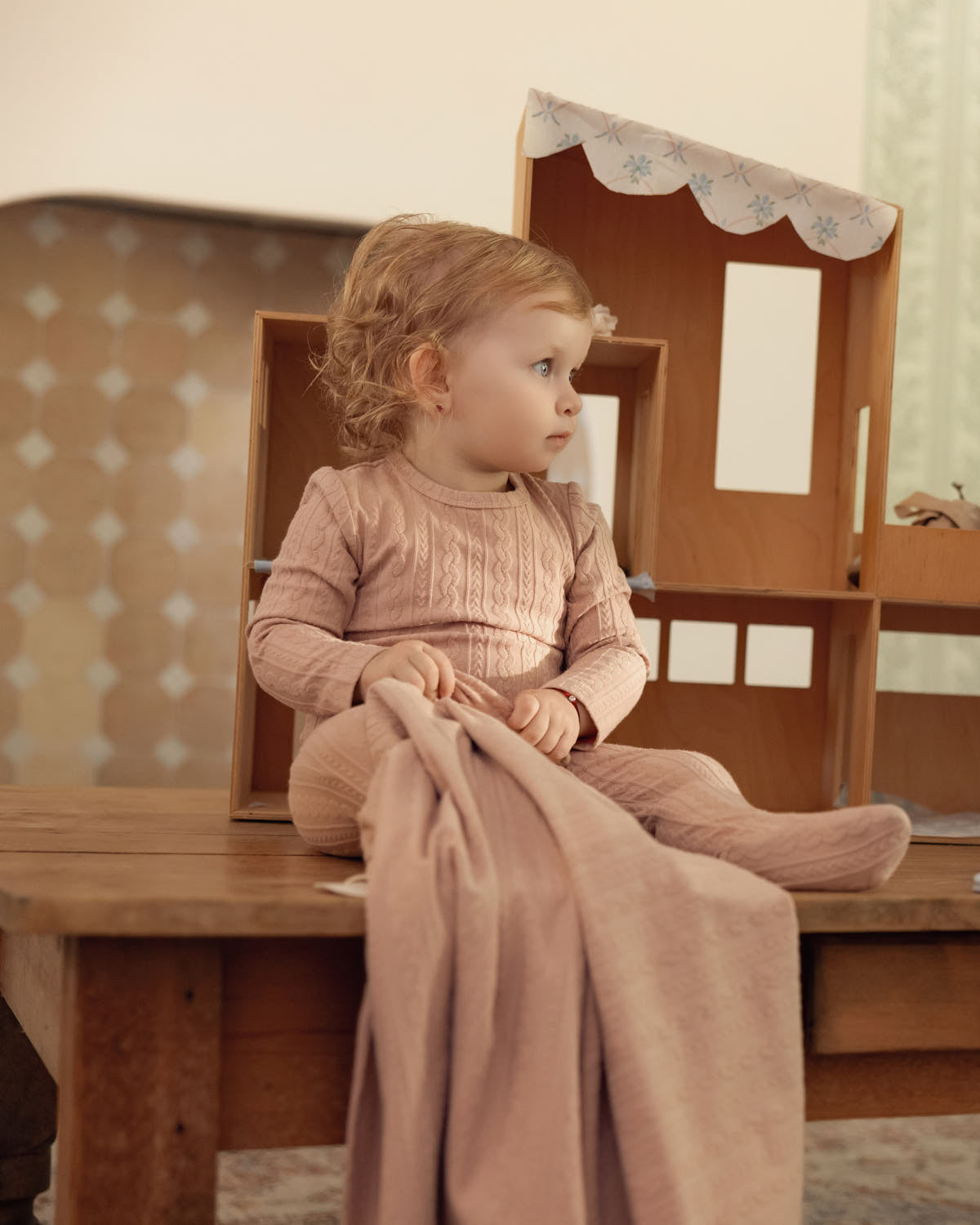 It resembles a classic cable knit. But this elegant baby blanket actually features a faux-cable weave with a rich jacquard pattern for a gorgeous brocaded effect. It's cotton-rich for blissful softness and breathable comfort. Plus, it has knit-in spandex for flexible shape-keeping stretch. Perfect layette or baby shower gift.