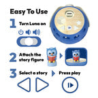 Simply place the Owl Luna on top of the projector, press the on button, and watch as the magic unfolds! The perfect way to foster a love of storytelling, spark imagination, and create a soothing bedtime routine.