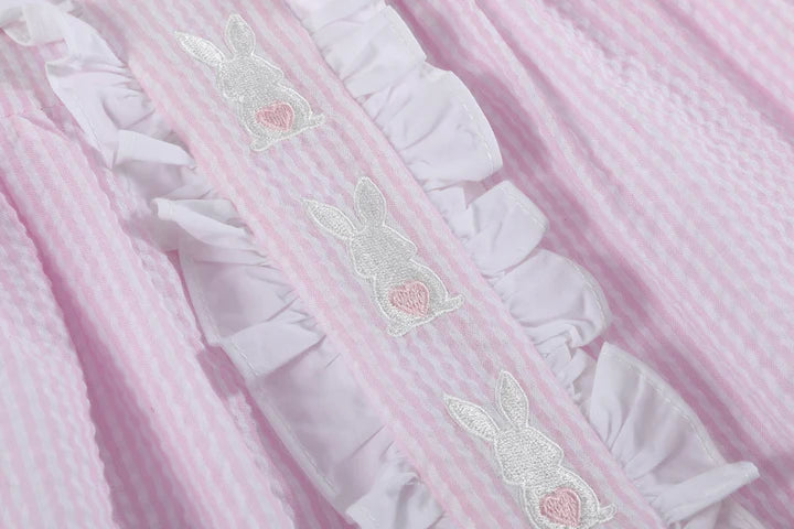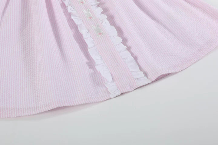 Get your little bunny ready for Easter in this adorable Pink Seersucker Easter Bunny Ruffle Dress! Featuring a crisp white collar and playful white ruffle trim, this dress is perfect for Easter Sunday and the entire spring season. The charming embroidered bunnies, complete with heart-shaped tails, add a delightful touch that will have her hopping with joy all day long!