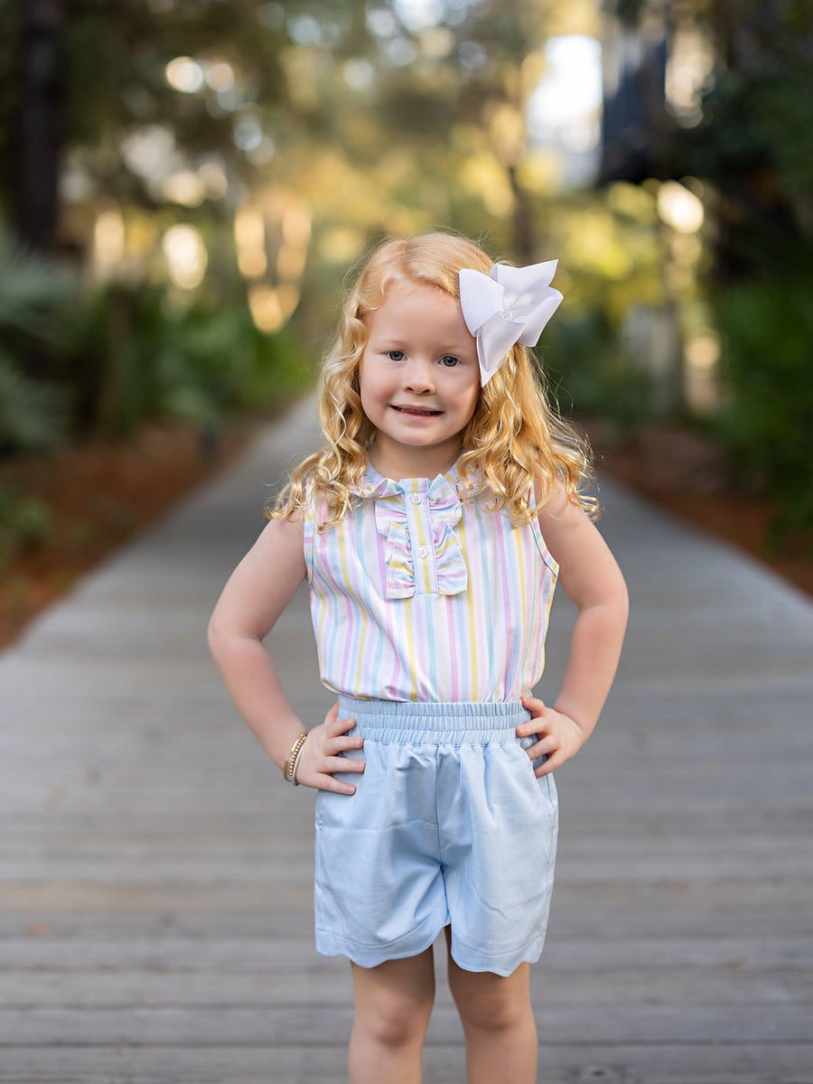 Our Lucy Pastel Striped Shirt for girls is such a good choice for spring! The soft knit material and bright colors will make dressing for warm weather effortless and stress free! We added buttons to the front and a small ruffle around the neckline and down the buttons to dress it up a little bit!