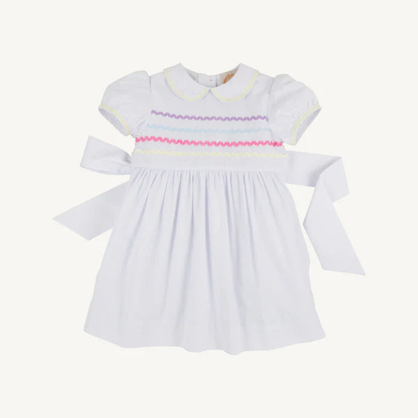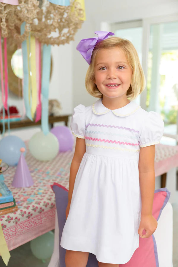 The Cindy Lou Sash Dress in Worth Avenue White features playful multicolor ric rac that adds a pop of personality to this timeless silhouette. This charming dress is perfect for everything from birthday parties to Sunday brunch. The classic sash tie and cheerful trim make it an instant favorite that she'll reach for again and again!