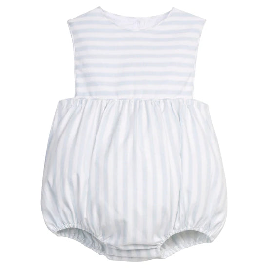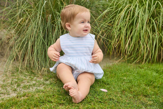 Our Apron Bubble is a sleeveless silhouette for baby with wide cut sides for easy movement and subtle gathers at the waist. Mixed horizontal and vertical soft blue and white stripes add a little extra detail to this simple style. Dress the whole family in our coordinating Savannah Stripe styles; it's an easy choice for summer vacations, beach family photos, or classic summer outings!