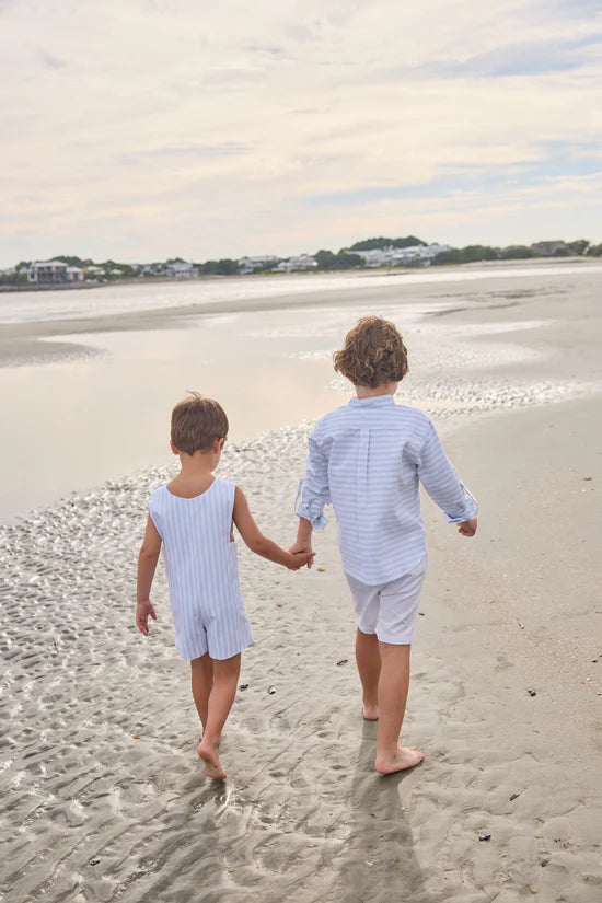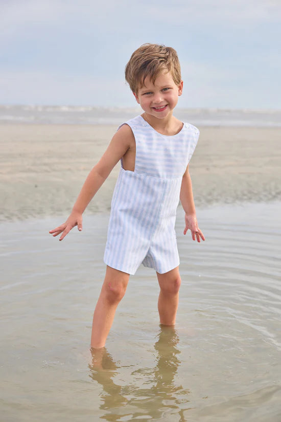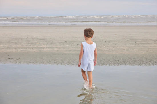 Our Apron John John for toddler boys features wide cut sides, button closures at each shoulder, and mixed horizontal and vertical stripes for a little extra detail! Light and breezy, the Savannah Stripe Collection features classic summer silhouettes in soft blue and white stripes for sibling matches of all ages!