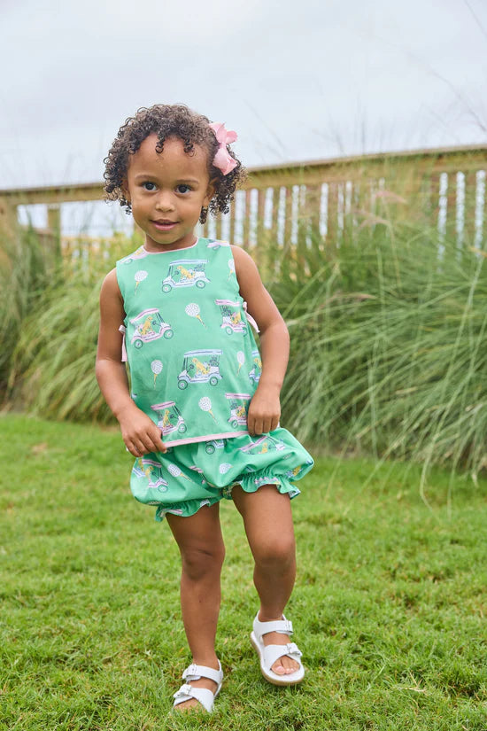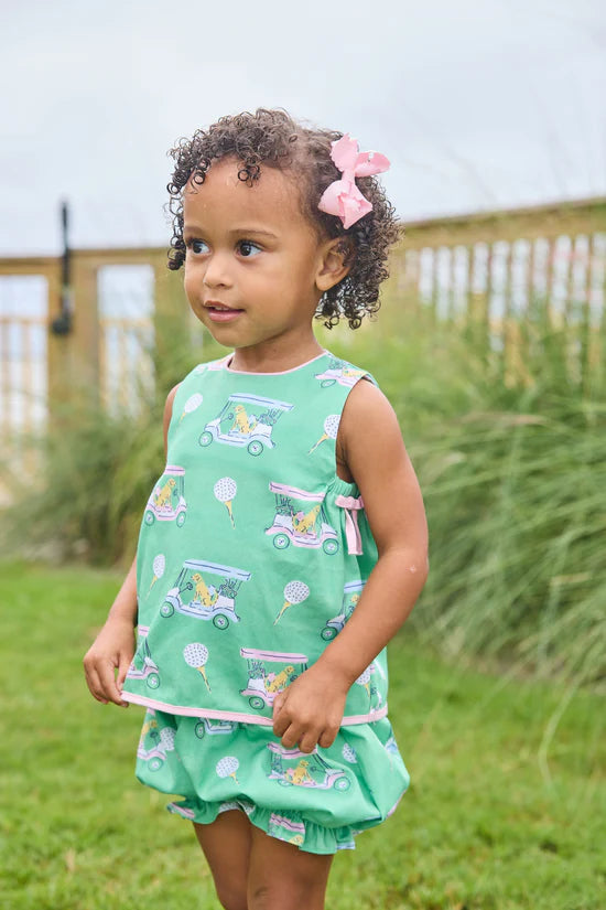 Tee off in signature Little English style with our Paws on Par Collection! Our Lily Bloomer Set in our Pink Paws on Par print features light pink contrast piping and fixed bows on the sleeveless top. The matching bloomer in the pink golf cart and lab print completes the look for toddler girls. Both playful and timeless, this adorable two-piece set is paw-sitively perfect for your little golfer!