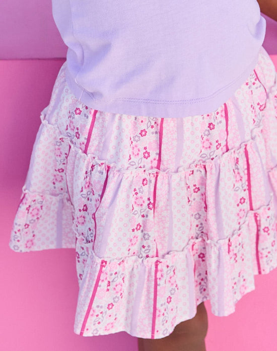 Meet our new Natalie Skort! With tiers, ruffles, and an adorable pink floral stripe, she's everything your little fashionista has been asking for! We love the breezy cotton fabric and super-soft shorts built into the style, making this skort perfect for the girl on the go! She'll wear this everywhere from school to parties and beyond. Dress her down with one of our eyelet tanks or dress her up with a halter top - either way, it's a style she'll wear on repeat.