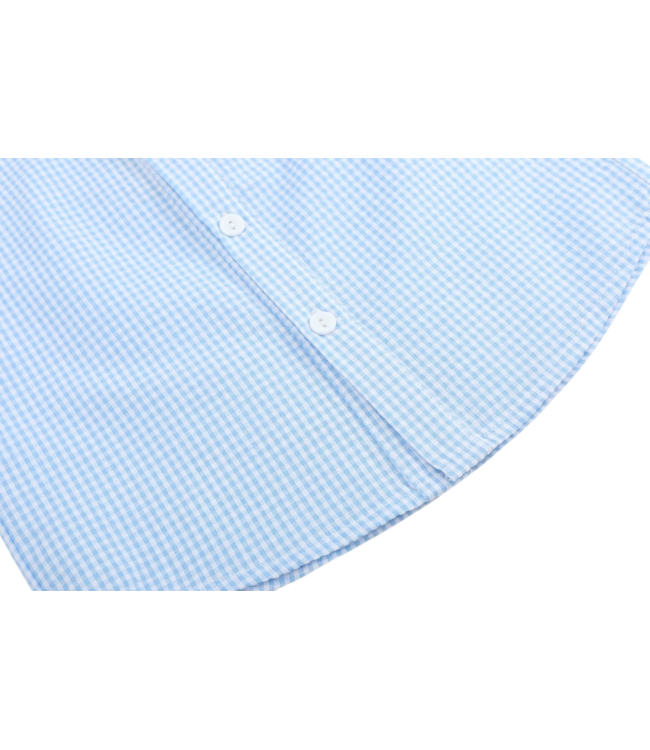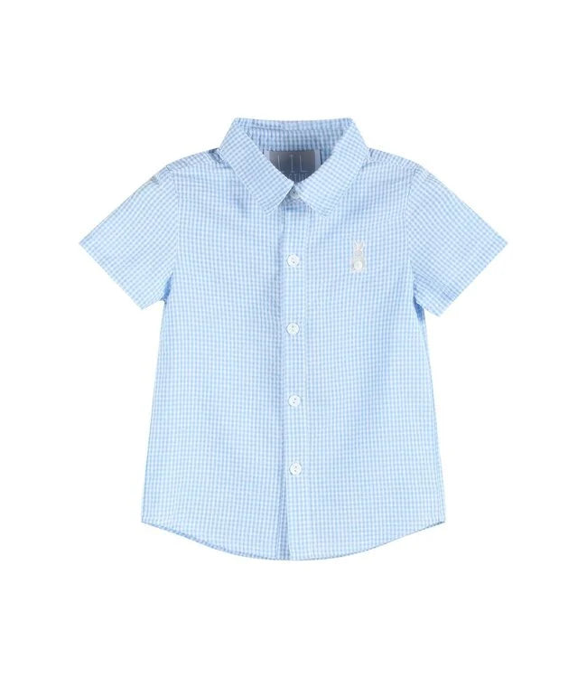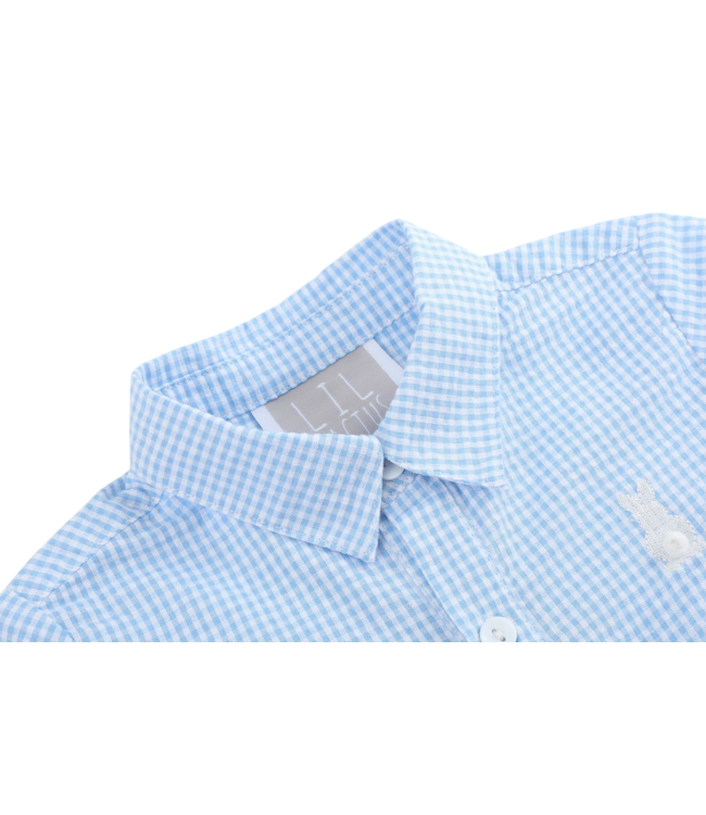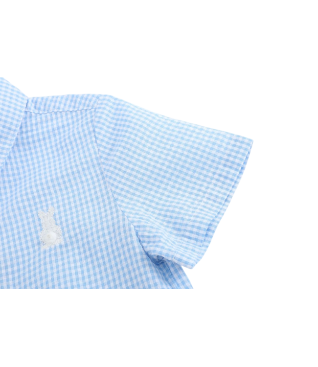 Classic style meets Easter charm in the Lil Cactus Blue Gingham Dress Shirt. This crisp button-up features a soft blue gingham pattern and an embroidered bunny with a pom-pom tail, perfect for Easter Sunday, spring photos, and family gatherings.
