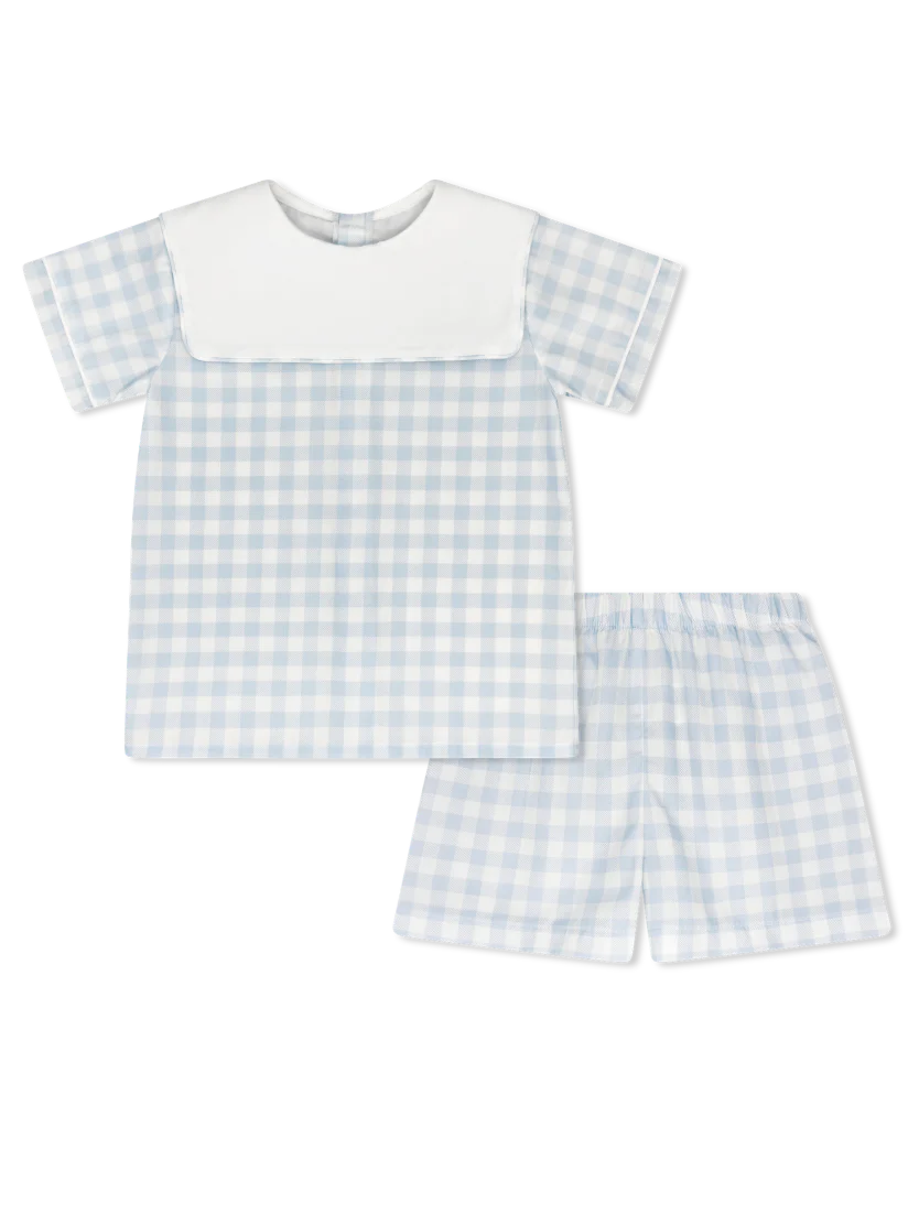 Classic and polished, the Christian Short Set in Blue Buffalo Check is a timeless choice for portraits, church, or Easter celebrations.