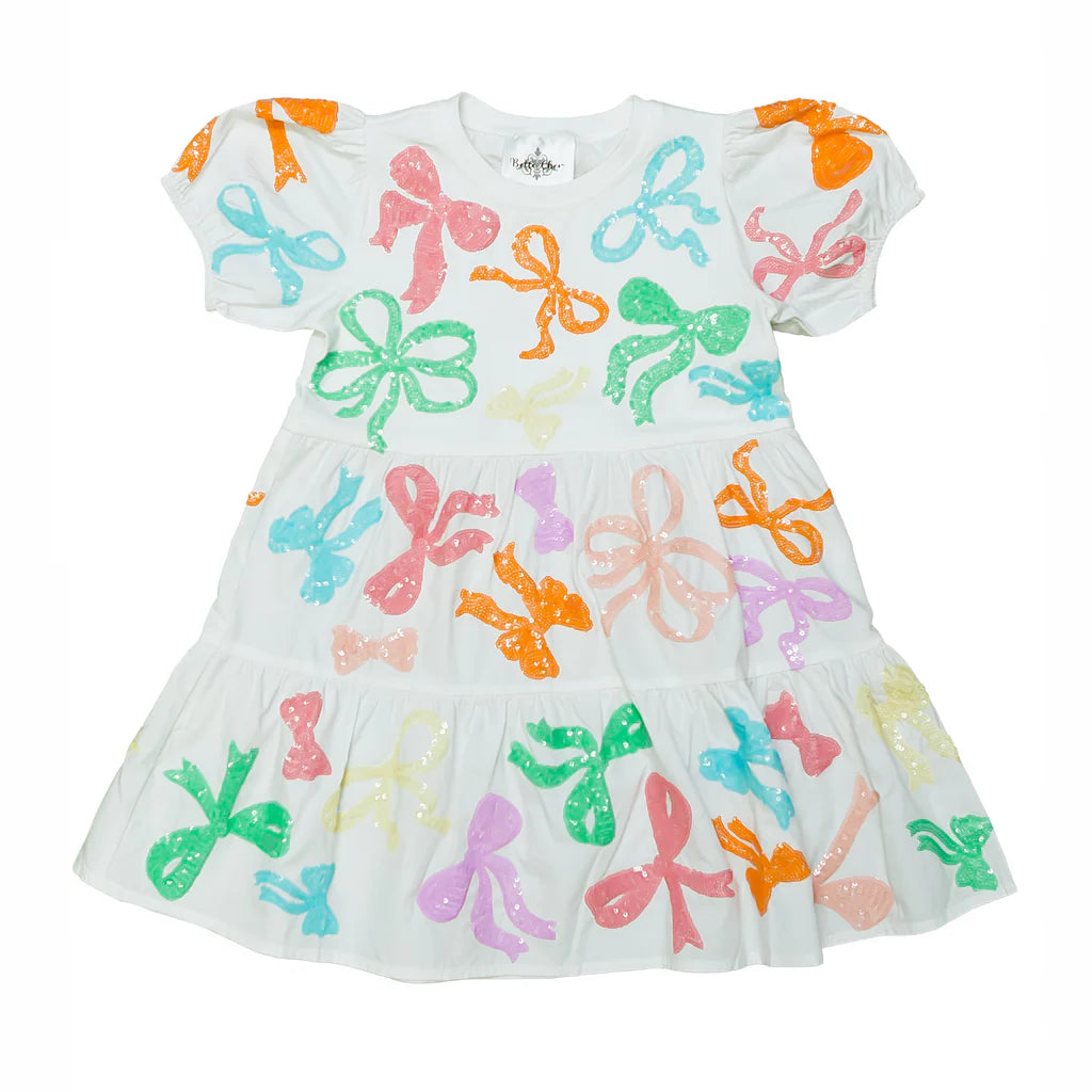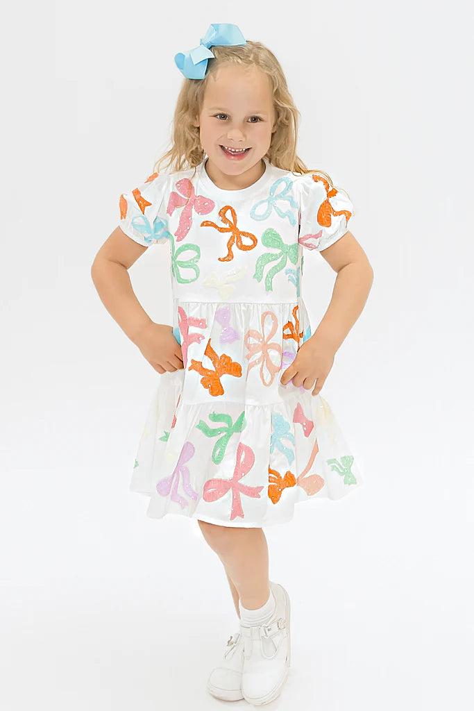Twirl into the spotlight in this adorable All Over Bows Dress, where playful sequin bows steal the show! Covered in shimmering bow details from top to bottom, this dress brings instant sparkle and charm to any occasion. Perfect for girls who love a little extra glam, the sequin embellishments catch the light with every move. Whether she's heading to a party, special event, or just wants to feel fabulous, this dress delivers major style points with its fun, feminine design.