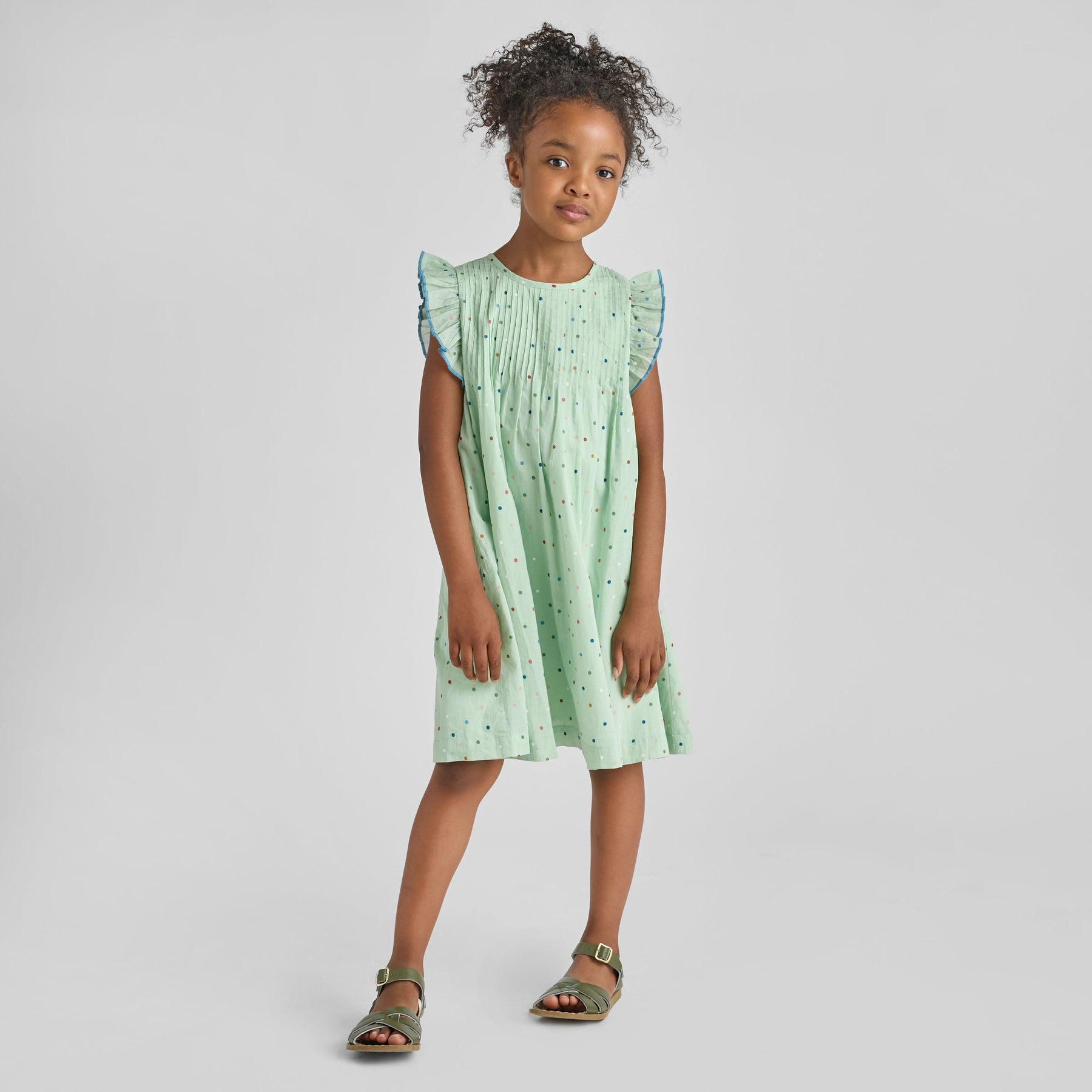 The Girls Jaipur Dress blends classic charm with playful detail! A smocked chest creates a comfortable, flexible fit, while ruffle sleeves and blue pearl stitching add thoughtful finishing touches. Silver glitter buttons down the front bring just the right amount of shine, and the pastel green polka dot print keeps the look fresh and spring-ready. Easy, breezy, and made for sunny days.