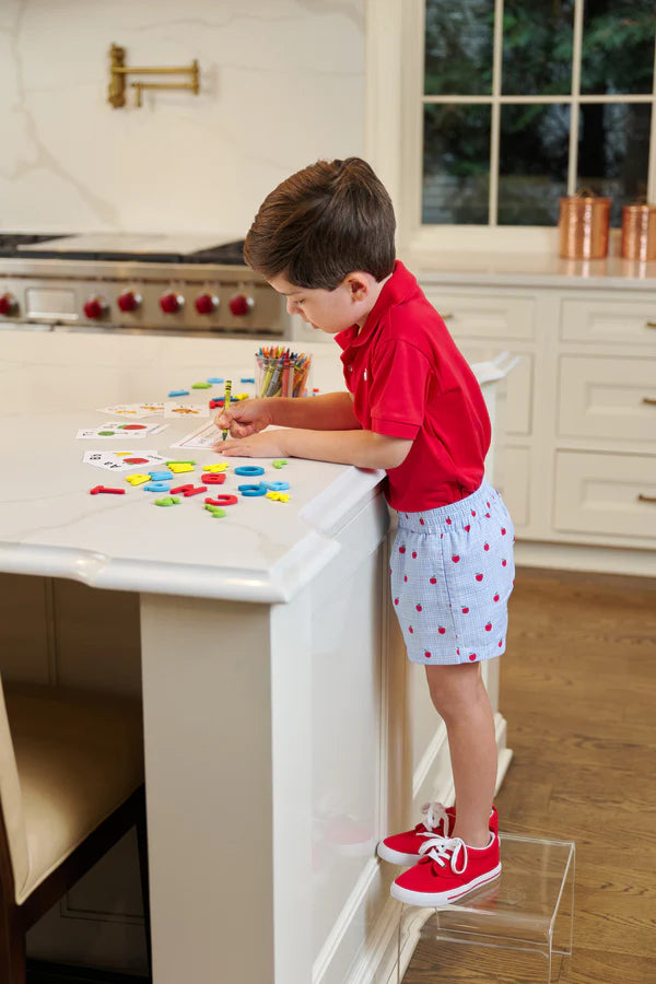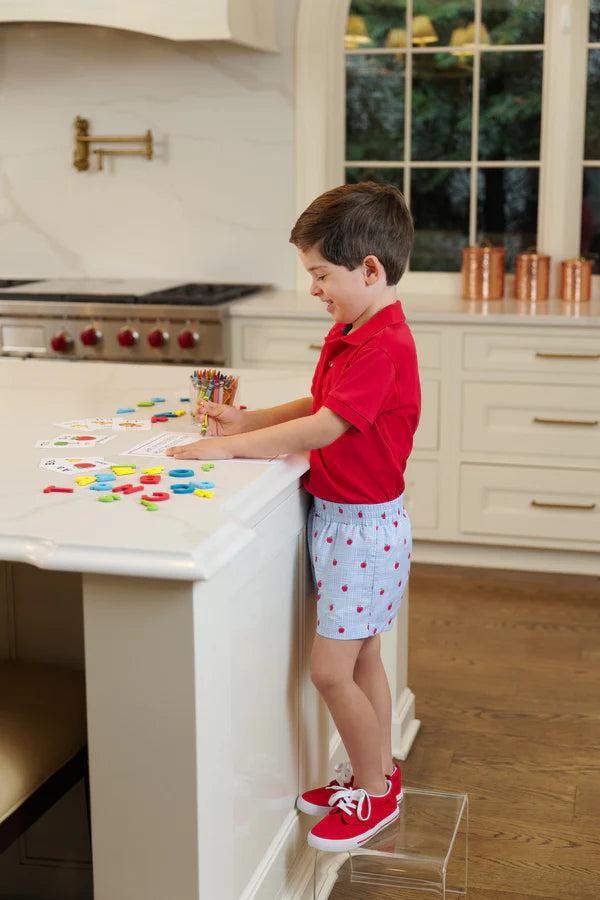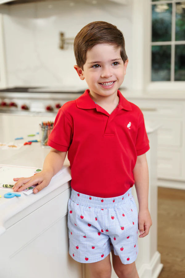 Our Sheffield Shorts in Apple of My Eye with Wood Boat Blue Stork are preppy and practical! The elastic waist makes diaper changes and potty training so much easier, and you'll love how put together he looks. Pair them with any of our Prim & Proper Polos or Carter Crewnecks.