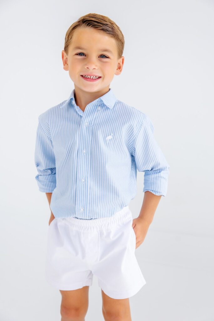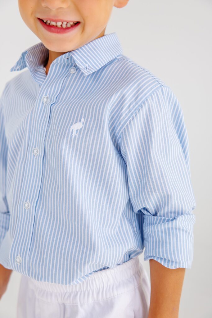 Our Dean's List Dress Shirt in Barrington Blue Tally Ticking Stripe with Worth Avenue White brings timeless preppy style to his wardrobe. This classic boys' dress shirt features crisp stripes and quality tailoring that's perfect for special occasions, school events, or any time he needs to look his best. Designed with attention to detail and crafted for all-day comfort, it pairs beautifully with dress pants, khakis, or coordinating pieces for a polished look.