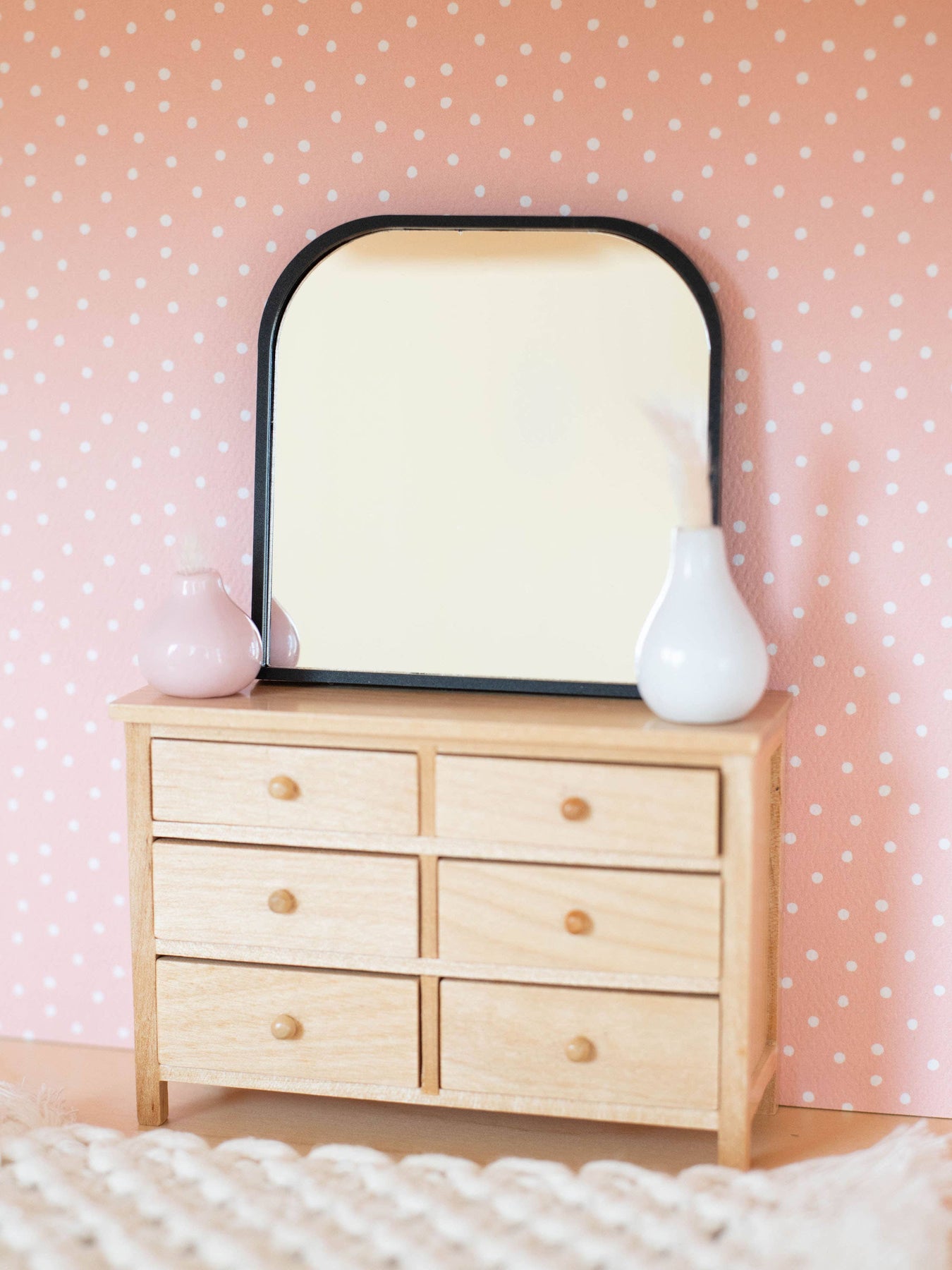 A classic style mirror to bring an elegant touch to walls, fireplace mantles, bathrooms and more! Whether adorning the living room, dining room or bathroom of the dollhouse, the mirror effortlessly becomes the focal point of the miniature interior. Its presence breathes life into the surroundings, giving the illusion of a tiny, enchanting world that mirrors our own. Specifications: Includes: 1 mirror in your chosen frame color/material Scale: 1:12 Measurements: Width: 3.25 in Height: 3.25 in *All other accessories sold separately